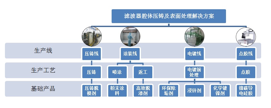 滤波器腔体压铸及表面处理解决方案涉及到滤波器腔体的压铸、涂装、电镀、点胶四个工艺流程,包括了压铸脱模剂、粉末涂料、高效脱漆剂、环保除垢剂、浸锌剂、化学镀镍剂、镍碳导电硅胶共七种基础应用产品。以上均由威富集团材料研发中心自主研发而成。